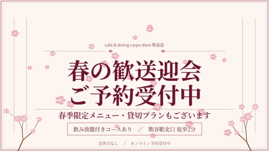 春の歓送迎会シーズンがやってまいりました。cafe&dining carpe diem 熊谷店では、少人数から貸切まで幅広くご対応しております。